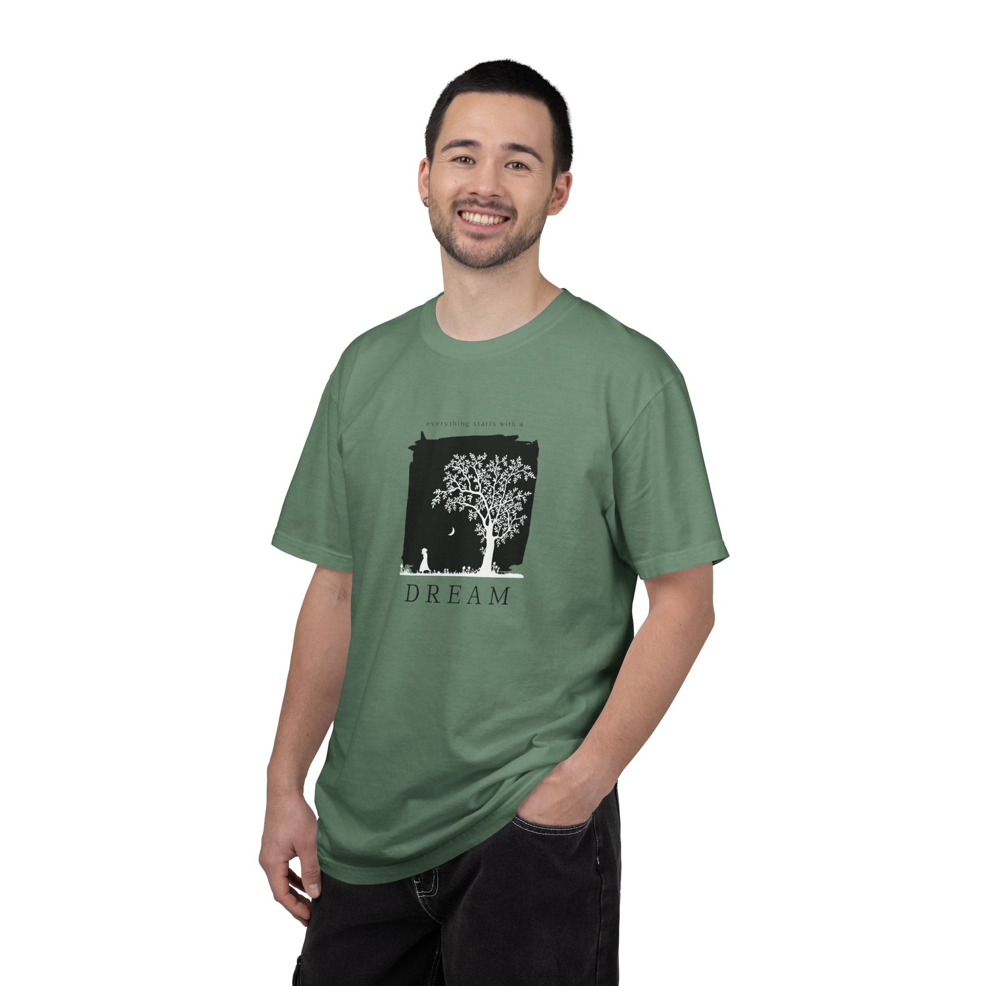 Soft, lived-in cotton with a quiet art print that feels like a personal reminder to slow down. This heavyweight garment-dyed tee drapes with a relaxed silhouette and shows a small, dreamy illustration of a tree and figure inside a distressed square, with the word “DREAM” beneath. It’s the kind of shirt you reach for when you want comfort and calm — a wearable pause between busy days. The muted color from post-construction dyeing gives each piece subtle variations, so every shirt carries its own gentle character.