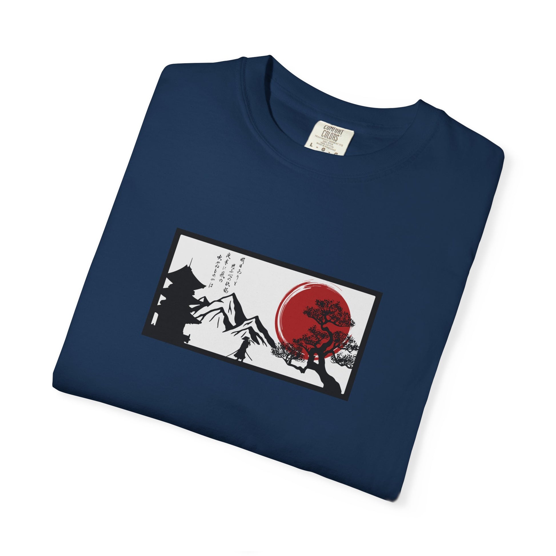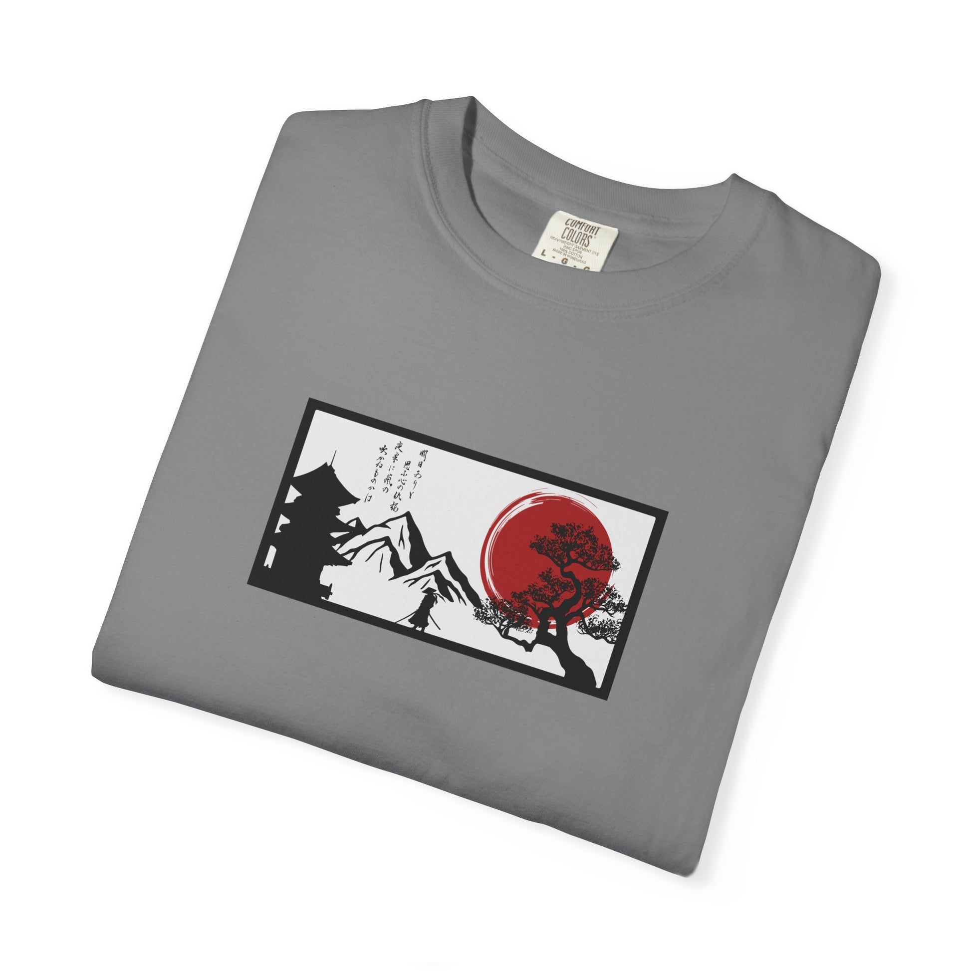 A soft, garment-dyed cotton tee that carries a quiet, Japanese-inspired scene across the chest: a silhouetted pagoda and bonsai-like tree framing distant mountains beneath a bold red sun. The shirt feels lived-in from the first wear thanks to the after-dye process and heavyweight 100% ring-spun cotton. Its relaxed cut and tubular construction give a clean, comfortable silhouette that suits slow mornings at a tea shop, wandering through temple gardens, or layering under a jacket for city evenings. This T-shirt settles into your rotation — tactile, unpretentious, and visually striking without shouting. It pairs well with worn denim, canvas sneakers, or a lightweight kimono-style jacket for a subtly curated look.